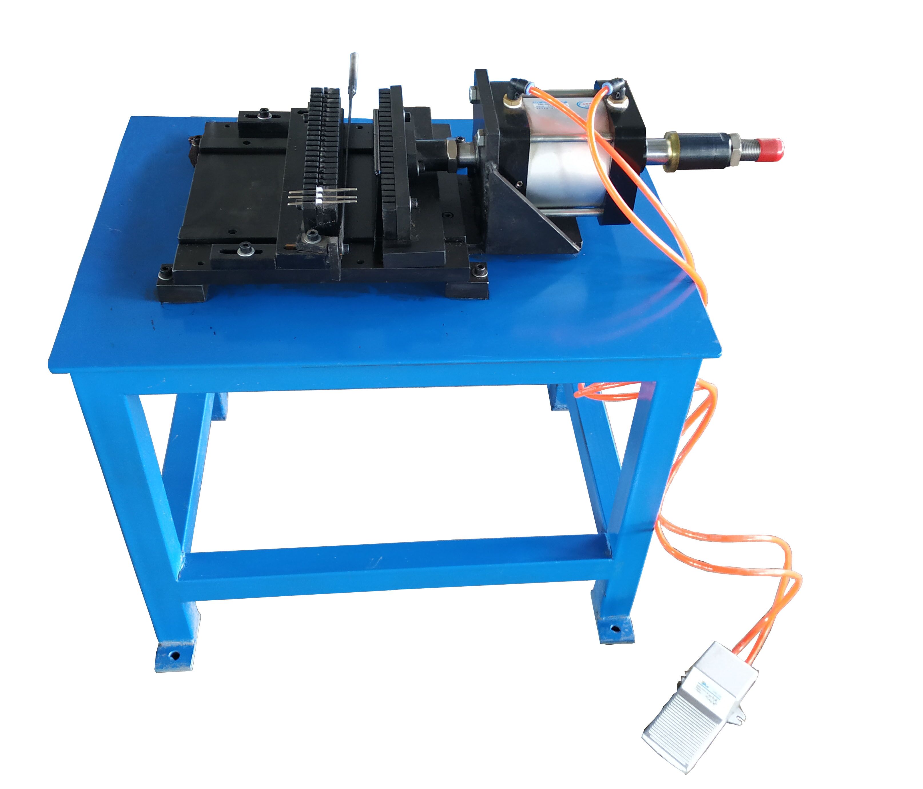 工作原理:工裝利用氣缸的動(dòng)力,將引出棒和下端封口塞排列在定位槽內(nèi)踩下腳踏閥(也可協(xié)商制成電控按鈕)12-24支引出棒便自動(dòng)壓裝入下端封口塞。這種裝置勞動(dòng)強(qiáng)度低,生產(chǎn)效率高。